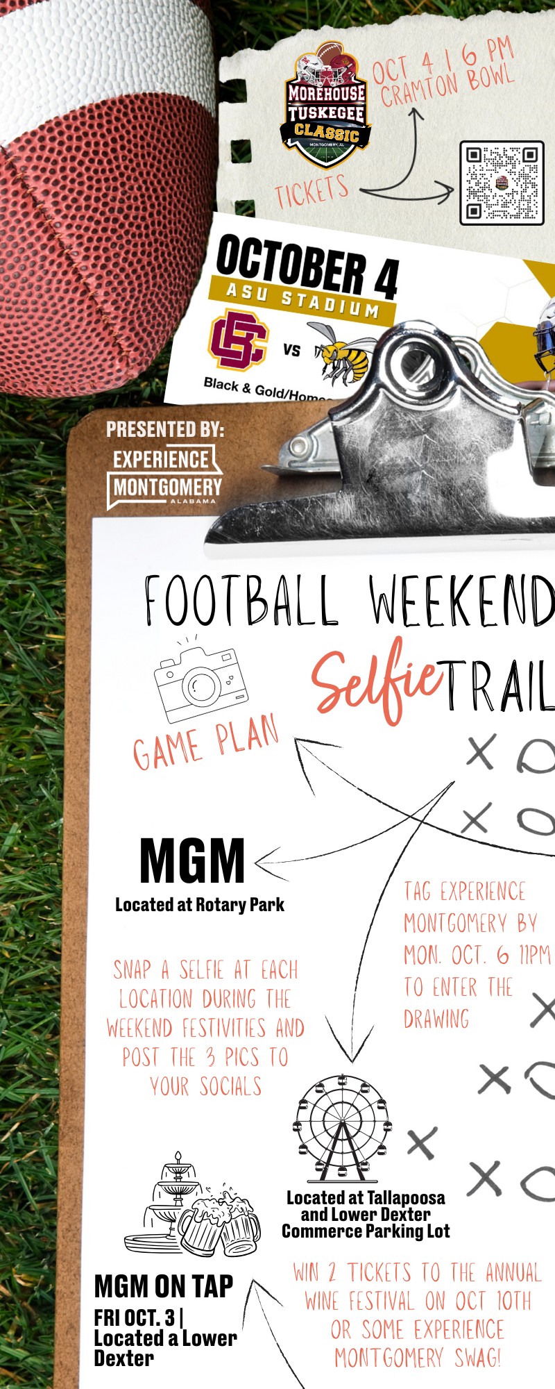 Celebrate football weekend in Montgomery with a little extra fun! Join the Selfie Trail by snapping photos at three key spots during the festivities: